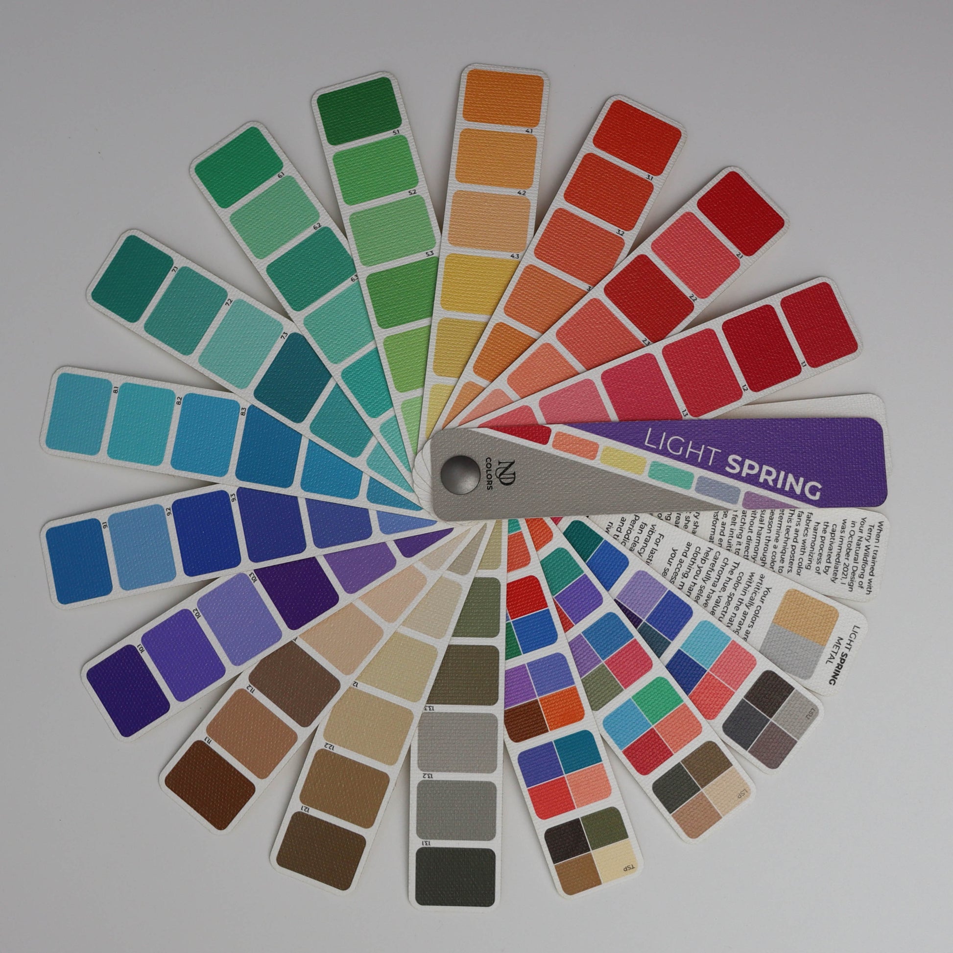 [{"id":469829091548,"handle":"classic-collection-copy","updated_at":"2026-04-19T06:19:57-05:00","published_at":"2026-03-25T09:07:11-05:00","sort_order":"manual","template_suffix":"","published_scope":"web","title":"Classic Fan Collection","body_html":"\u003cp\u003eLarge and mini fans in each of the 12-tone seasons\u003c\/p\u003e\n\u003cul\u003e\n\u003cli\u003e\u003cspan class=\"a_GcMg font-feature-liga-off font-feature-clig-off font-feature-calt-off text-decoration-none text-strikethrough-none\"\u003eThe 78 colors are in a new layout artistically arranged in the natural color spectrum.\u003c\/span\u003e\u003c\/li\u003e\n\u003cli\u003e\u003cspan class=\"a_GcMg font-feature-liga-off font-feature-clig-off font-feature-calt-off text-decoration-none text-strikethrough-none\"\u003e\u003cmeta charset=\"utf-8\"\u003eColor numbers are a great tools to communicate about individual colors, for example, is this item a Bright Winter 1.2 red fuchsia. \u003c\/span\u003e\u003c\/li\u003e\n\u003cli\u003e\u003cspan class=\"a_GcMg font-feature-liga-off font-feature-clig-off font-feature-calt-off text-decoration-none text-strikethrough-none\"\u003eEach fan has the season and the two surrounding season's harmony strips to help discern between seasons.\u003c\/span\u003e\u003c\/li\u003e\n\u003cli\u003e\n\u003cspan class=\"a_GcMg font-feature-liga-off font-feature-clig-off font-feature-calt-off text-decoration-none text-strikethrough-none\"\u003eFan numbers have been moved to the right side for a cleaner view of each strip.\u003c\/span\u003e\u003cspan class=\"a_GcMg font-feature-liga-off font-feature-clig-off font-feature-calt-off text-decoration-none text-strikethrough-none\"\u003e \u003c\/span\u003e\n\u003c\/li\u003e\n\u003cli\u003e\u003cspan class=\"a_GcMg font-feature-liga-off font-feature-clig-off font-feature-calt-off text-decoration-none text-strikethrough-none\"\u003eEach fan includes a strip with representation of each seasons metal color.\u003c\/span\u003e\u003c\/li\u003e\n\u003cli\u003e\u003cspan class=\"a_GcMg font-feature-liga-off font-feature-clig-off font-feature-calt-off text-decoration-none text-strikethrough-none\"\u003eA fan strip with the NDU Colors story.\u003c\/span\u003e\u003c\/li\u003e\n\u003c\/ul\u003e","image":{"created_at":"2026-03-25T08:34:04-05:00","alt":null,"width":3859,"height":3859,"src":"\/\/nducolors.com\/cdn\/shop\/collections\/IMG_7586_ba41dcba-04c4-4aea-bb55-67a326514bf6.jpg?v=1774445644"}},{"id":416140624092,"handle":"light-spring","title":"Light Spring","updated_at":"2026-04-19T06:19:57-05:00","body_html":"Light Spring Collection","published_at":"2023-03-10T15:36:48-06:00","sort_order":"manual","template_suffix":"","disjunctive":false,"rules":[{"column":"tag","relation":"equals","condition":"Light Spring"}],"published_scope":"web"},{"id":416140984540,"handle":"mini-fan","title":"Mini Fan","updated_at":"2026-04-19T06:19:57-05:00","body_html":"\u003cmeta charset=\"utf-8\"\u003e\u003cspan\u003eShop all 12 seasons in our mini fan size | 1 x 5\"\u003c\/span\u003e","published_at":"2023-03-10T15:53:44-06:00","sort_order":"manual","template_suffix":"","disjunctive":false,"rules":[{"column":"tag","relation":"equals","condition":"Fan"},{"column":"tag","relation":"equals","condition":"Mini"}],"published_scope":"web"},{"id":467267125468,"handle":"ndu-colors-season-palettes","updated_at":"2026-04-19T06:19:57-05:00","published_at":"2026-02-09T12:51:16-06:00","sort_order":"best-selling","template_suffix":"","published_scope":"web","title":"NDU Colors Season Palettes","body_html":""}]